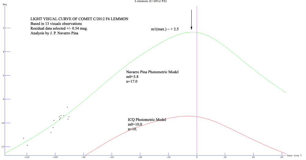 Hola a todos , este cometa de orbita cuasi-parabolica e=0.998503, y segun las efemerides , solo alcanzaria magnitud visual maxima de +9.4 para finales de marzo de 2013 , pero su actual curva de luz lo podria situar en magnitud visual maxima de +2.5 para esas fechas , hay pocas observaciones visuales de este cometa dada su baja declinacion , ahora mismo -33º , y una elongacion de 82º , bajara al hermisferio sur durante los primeros meses de 2013 para subir luego en marzo de declinacion , el cometa se haria visible para nosotros a finales de abril , cuando el cometa rondase teoricamente la magnitud visual +4 o +5 si sigue la actual curva de luz visual , segun ICQ su formula de brillo seria :