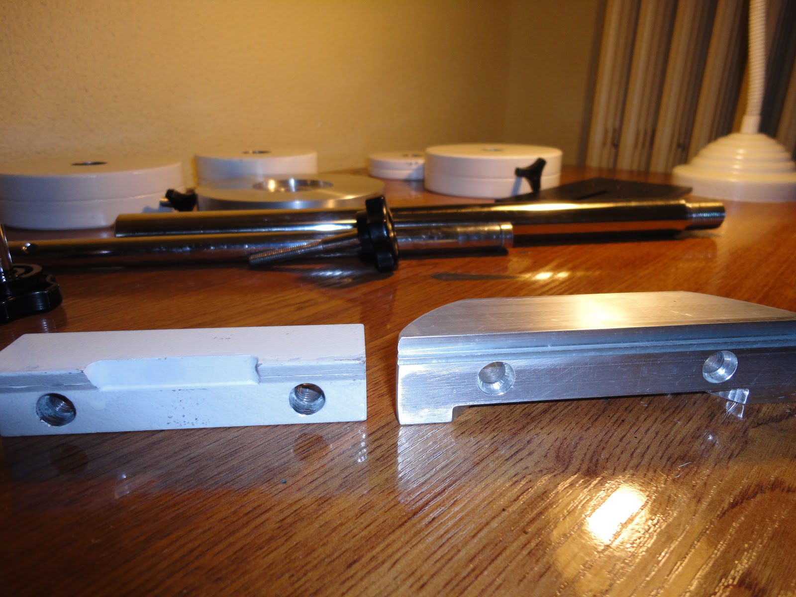 Sobre el eje de altitud he visto muchas ideas de como mejorar el apoyo que hacen los tornillos, cambiar por tornillos de acero articulados (los de GEOPTIK), cambiar por los de palomillas (los de Skywatcher), pero al final me he animado a hacer un apéndice que mejore la zona de apoyo, tal y como veis en la fotografía siguiente: