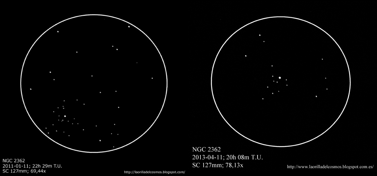 La noche del 2011 viendo el rico campo estelar que se ofrecía ante mis ojos decidí descentrar NGC 2362 para dar cabida a todo lo que me atraía. Sin embargo, en 2013, a duras penas resaltaba el cúmulo abierto… y con un número menor de componentes, prácticamente la mitad.